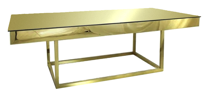 Нержавеющая сталь. Золотая гальваника. Нижняя столешница – золотое зеркало, верхняя столешница – прозрачное стекло. Высота пространства между столешницами 10 см.